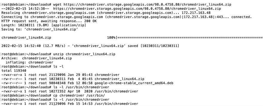 $ wget https://chromedriver.storage.googleapis.com/98.0.4758.80/chromedriver_linux64.zip